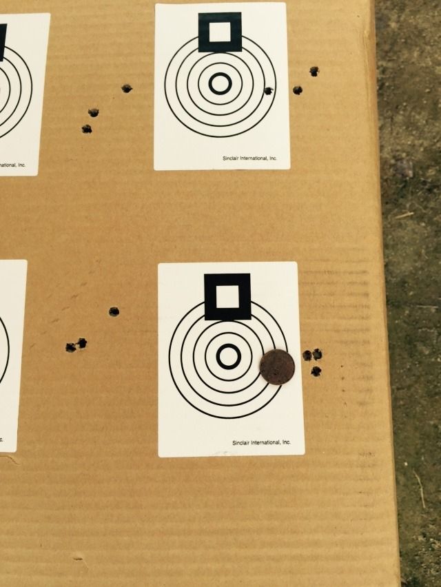 This morning I decided to start working on loads for an AR chambered in 5.56 that I built a few months ago. After reading a lot about the OCW (optimal charge weight) method for determining the best powder charge I decided to give it a try. To make a long story short I ended up loading 3 rounds for each of the following powder charges of Varget: 24.6, 24.8, 25.0, 25.2, 25.4, 25.6, 25.8, and 26.0. The max charge for the Hodgdon and Sierra load data with the 69 gr MK was 26.0 and 26.1 respectively. I shot the 4 loads in a round-robin style like the OCW method recommends and the groups were terrible. Then I fired the last four charge weights the same way and here is a pic of the best target.
