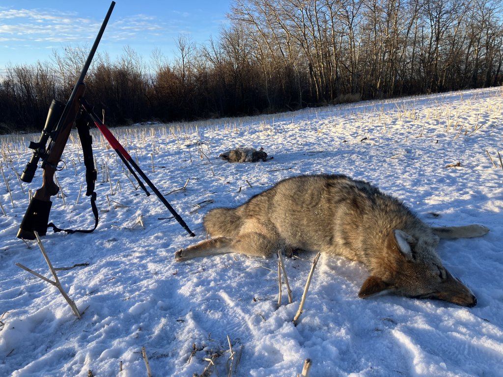 A quick series of yelps surprisingly pulls another coyote from the bush but not from where I expected as it showed up close to the first one shot. Once again with well placed crosshairs, a bullet is sent on its way netting coyote # 4 ( 198 yards).