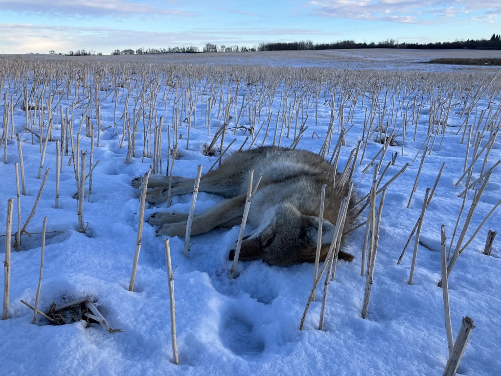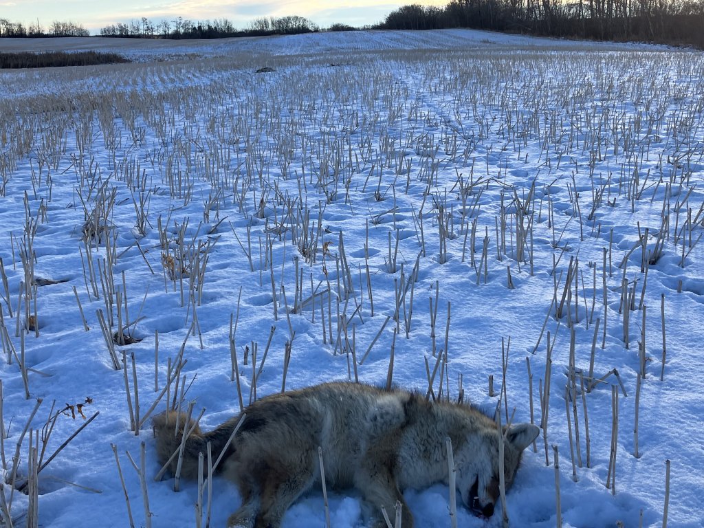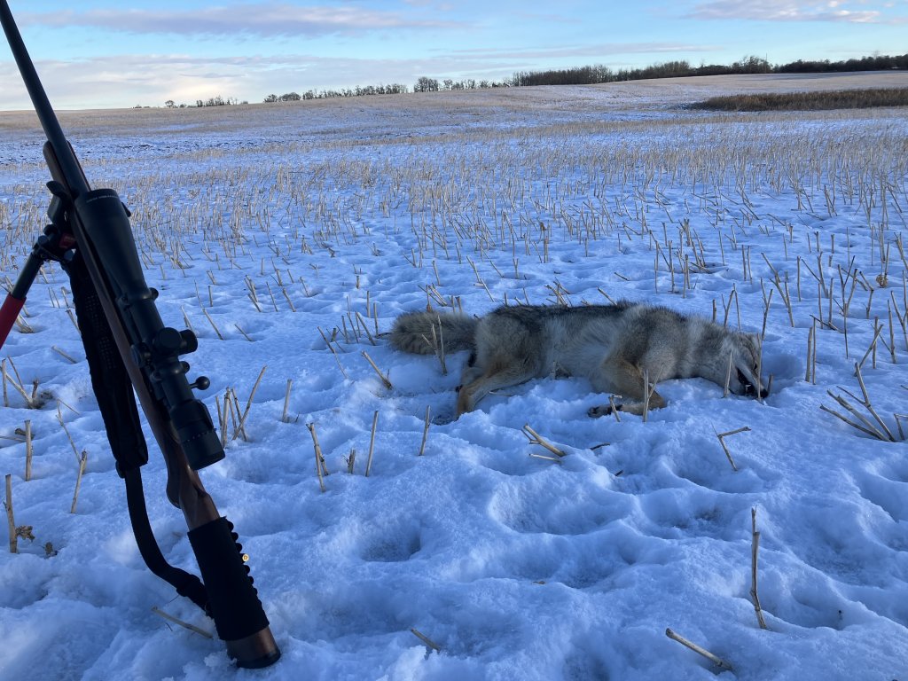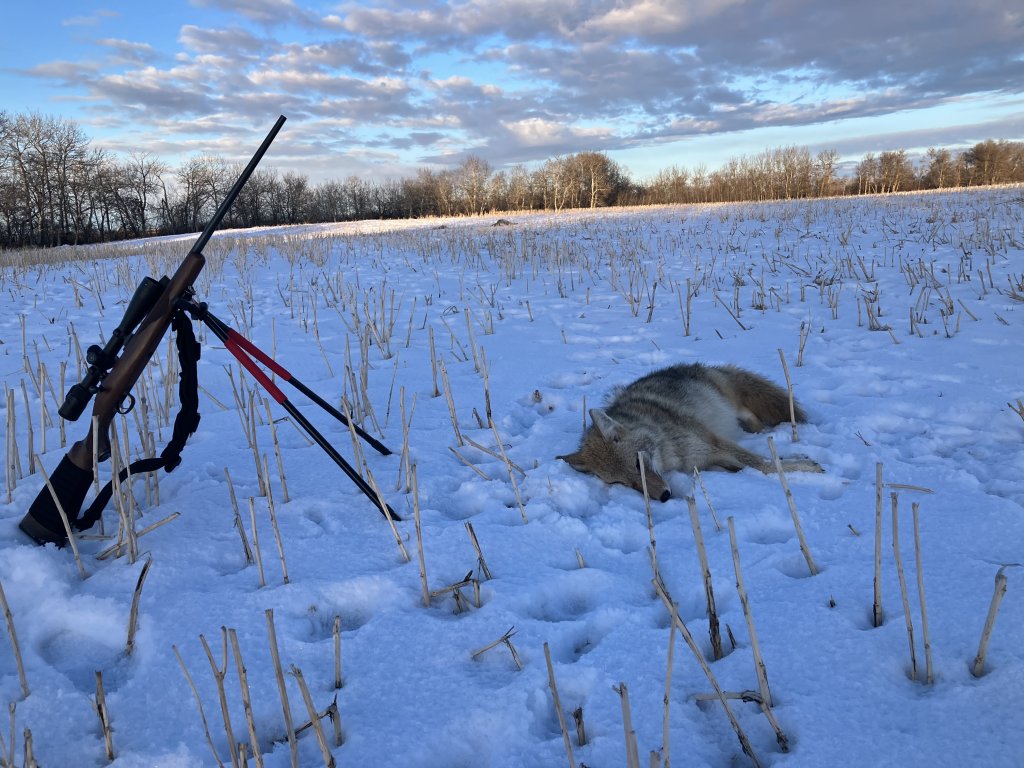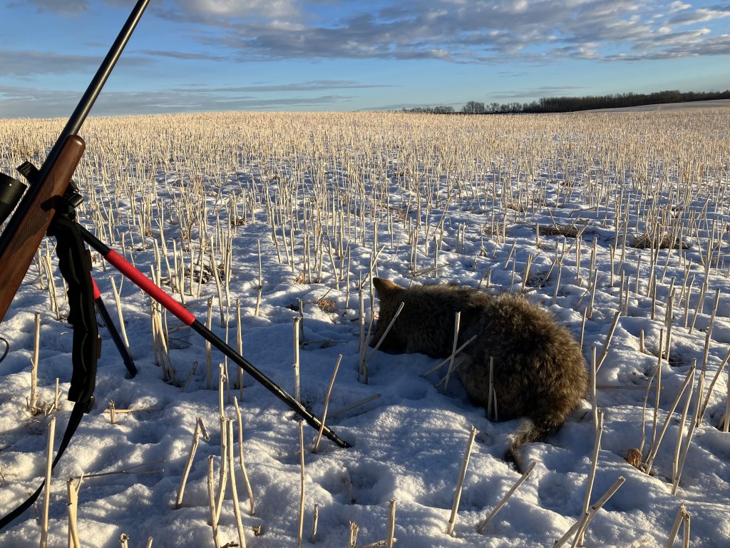 Following a well used coyote trail along the edge of the field, I see two coyotes directly west of me as I crest the first hill. Too early to shoot yet, so I let the pair make their way to the trees before I move on. Three hundred yards further west I crest the second hill which reveals a group of 4 coyotes near the location of the coyote I had shot almost a month earlier. To the north of the group of four is 2 more coyotes which complicates my approach of being detected. Backtrack a few yards and cut into the trees and slowly make my west-ward journey once again. Within the cover of the trees I make my way to the spot where I intended to set up. The group of four are no longer visible and the pair to the north have laid down on a hilltop but neither seem to be looking in my direction. After a few minutes I see a single to the east which is following the same route as the very first two I encountered on my walk-in. A few more minutes pass and I see the group of four once again but now they’re much further west. I glance to the east and see another coyote travelling south following the same route as the other single. I have coyotes to the east, coyotes to the west and I’m situated in between with distances further than I care to shoot. Not looking to be a stellar setup location on my part but past history has proven otherwise and I hang tight as I have sniped a fair number of coyotes over the years from this very location. A mile north I see 3 more coyotes leaving the poultry farm and two look to be headed in my direction. I watch their slow progress through the binoculars but something to the west catches my attention. I see there is a single coyote standing a few yards from the carcass of the coyote shot back in November. With the 204 lined up and crosshairs on fur, a 220 yard shot has coyote number 1 down for the morning.