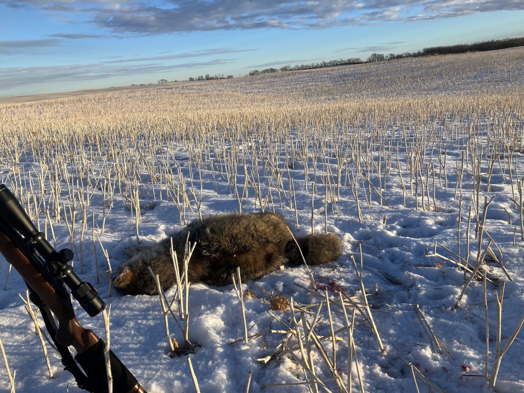 Once again, I pack up and about to stand up when I see another coyote following the same trail as the one I just shot. Following the same sequence as before I drop coyote # 6 at 185 yards. I think these last two coyotes were the same ones I saw earlier to the north of me and they had hung up in the slough bottom for sometime before venturing south once again.