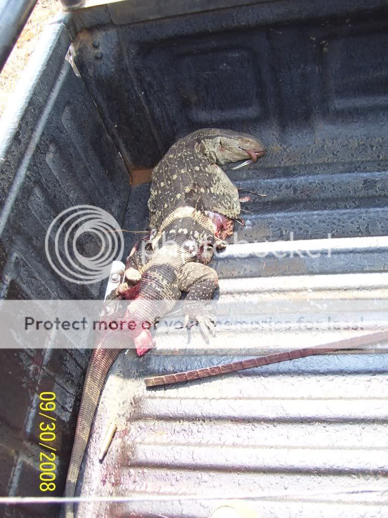 As the hissing and spitting continued, I continued to call on the radio "I'm being attacked by a cobra, help me!" However, I did not hear a response and knew that I was on my own. All at once, I changed my strategy, I would scream like a girl for as long as my vocal cords would allow, biding me time so that the PH would come and assist me to kill this snake. As I began screaming, I could hear the truck off in the distance, it was headed my way! Yea for me, closer and closer it came until finally the PH arrived at my hide. He was accompanied by two of my friends that had made the journey with me. They yelled from the truck "are you ok?' I said "[beeep] no I'm being attacked by a cobra and all I have is a [beeep] stick to defend my self what kind of stupid [beeep] question is that?" The PH advised me to leave the hide, to which I said "the cobra is at the entryway and I'm NOT going over it, I think I will stay in here." The PH got out with his big gun and chased the beast from the hide long enough for me to escape, at which point I ran as fast as my fat short legs would carry me and I jumped onto the hood of the truck. The PH then shot the culprit in the grass and lo and behold it was a Monitor lizard that measured 44" head to tail. My two companions named me the "Manly Man" and I have not heard the end of that.