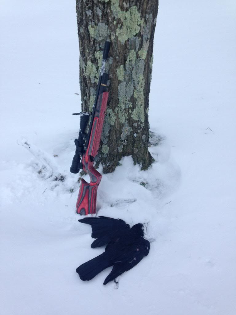 I set up under a small white oak and made a couple quick moans with bees gray slayer. I instantly got a response. At around sixty yards seven crows landed on a locust. I was surprised the crows didn't fly over my head but the wind was ripping and the snow was blowing hard. I took my rifle and placed the proper hold on the second mildot. Then I check the wind and held into it about a inch. I squeezed the half pound trigger and the crow dropped. The other crows scattered, I was hoping they would fly over giving me the chance for a double or a triple. I usually don't get worked up about getting crows but with a airgun in heavy wind it was a big deal to me.