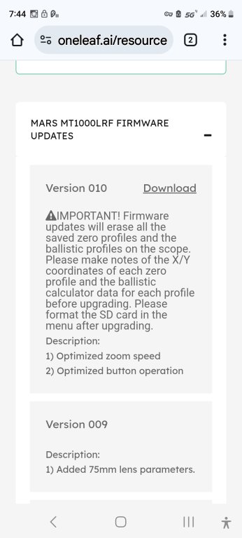 congrats on getting your oneleaf mars mt1000 640 .. i bought mine last november and really like it .. i want to pass along some information that i learned with my scope about the mars scopes , some have a bug in the firmware some dont , of the ones with the bug it does not cause an issue everytime .. the scope will always hold zero on base mag .. what the issue is when zoomed ocassionally the reticle will jump up and your shot will be about 18 inches high and when zoomed back to base mag it will return to zero .. oneleaf is aware of the problem and has released version 10 firmware that can be downloaded from their website .. install the "bug fix" firmware to resolve the problem .. my scope was version 9 firmware and had the problem , after the update to version 10 my scope works perfect .. good luck !