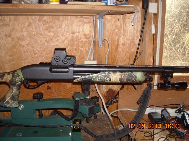 I have an Eotech XPS2 on a Remington 870 turkey model shotgun. I use it almost exclusively for night hunting. What I like about the Eotech is that all I have to do is get the red dot on the target and pull the trigger. It is a lot easier than trying to see the front bead while tracking a moving target. It is really handy for night hunting solo. No cons.