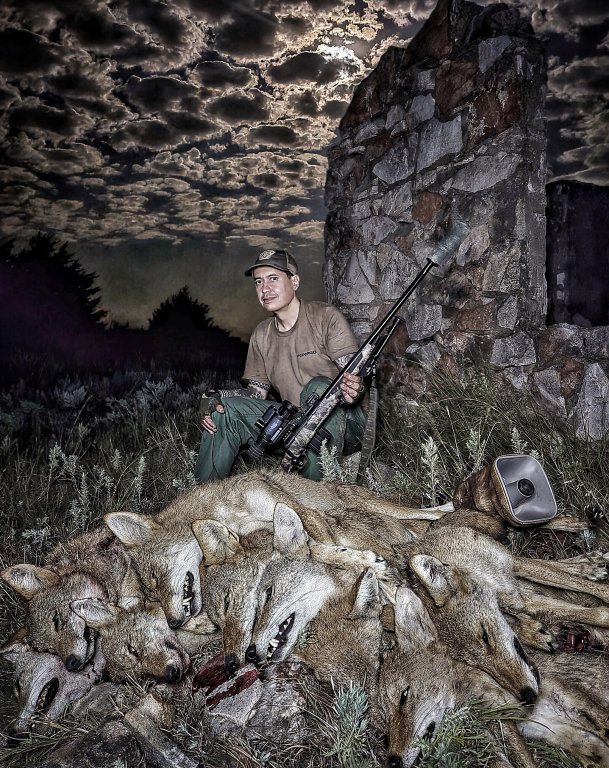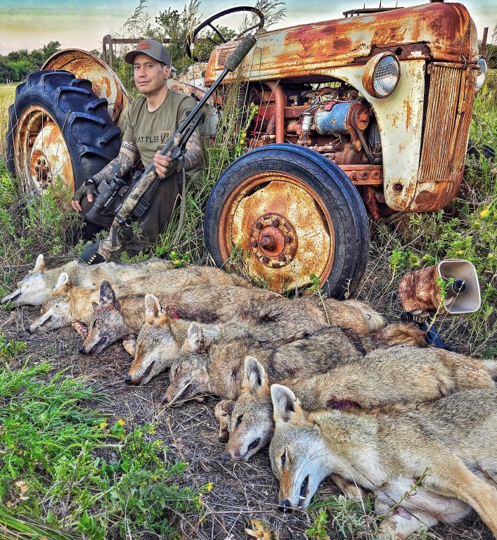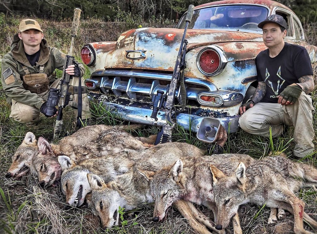Alex shot the first coyote, dragged it to the nearest two-track, and stumbled upon the remains of an old Chevrolet. I switched from a green to a white light to get a better look at the nostalgia we had just come upon. I told Alex to leave the coyote here, as we'd come back in the light for a picture. As I scanned into the distance, I saw another coyote, just as I heard Alex begin to open the door. We stopped the noise and headed off to dispatch that coyote. The coyotes were responding slowly, and coming in late in the stands. I worked on one coyote, finally dispatching it at the 34-minute mark. We walked past a lot of debris, through canyons, and followed green lasers to downed coyotes. We hunted until we could see without the aid of light or thermal, and returned to where we started for the picture.