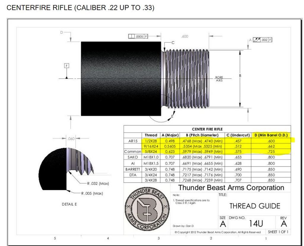 I'm looking for what is the max recommended caliber for each thread size. I understand barrel contour/thread specs. Is the material between the rifling in the bore and bottom of1/2x28 threads thick enough to handle the pressures of .243, .270, and 30-30? The one smith said 6.5/.264 is the biggest they'll go.