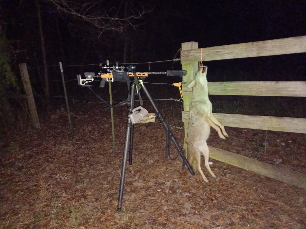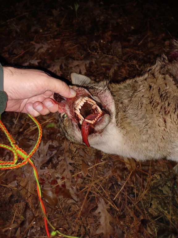 Here lately I haven’t been feeling well. However, I was tired of laying around and decided to go and see if I could get first blood with the new 22 CM build using the 62gr ELD-VT bullet. I typically walk 1-6 miles to my stands but not feeling well, the first stand was about ½ mile from the truck on 12/31/24 @ 11:30 PM which ended up being a bust. I could hear coyotes howling in the distance, so I went back to the truck and drove to where I thought they were (near a pipeline). Walked about 300 yds in on the pipeline and set up the call 100 yds behind me with the wind in my face on 01/01/2025 @ 12:50 AM. Started with a rabbit distress for two minutes, then muted the call and waited for five minutes. I then played a female coyote invite howl and was scanning with the monocular and caught a glimpse of something moving in the woods behind me (not the direction I thought they would come from), so I swung the gun around and didn’t see anything. I muted the call for a few minutes, then switched to MFK Roo pup fight and, a big male coyote popped out of the woods at 62 yards and the 22 CM hammered him (DRT) as the ELD-VT estimated velocity impact was around 3474 FPS.