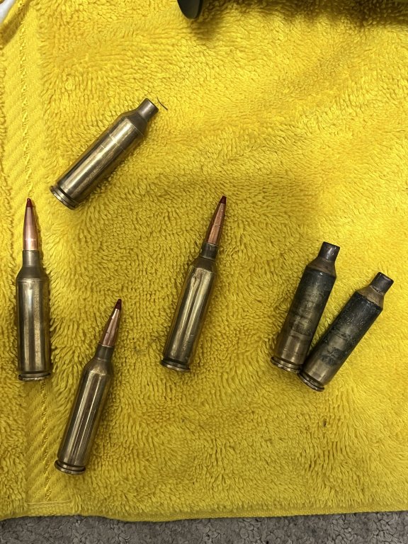 I have attached a photo of the nightmare ammo. You will see two rounds that were heavily blackened, indicating to me that the bullet was not held long enough to build pressure, with gas venting around the neck. The other rounds show bullet growth. I was using 0.020 jump to the lands and the barrel was cut by a very experienced gunsmith who was attempting to get the chamber to shoot the 62's accurately. The bullet that got lodged into the neck and did not allow the rifle to go into battery had a tip heavily bent. Those rounds were what was left of a 10 round magazine (prior shots were successful the prior night's hunt.)