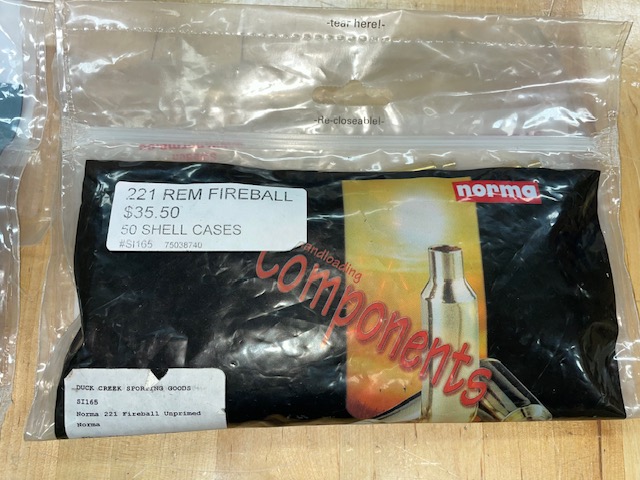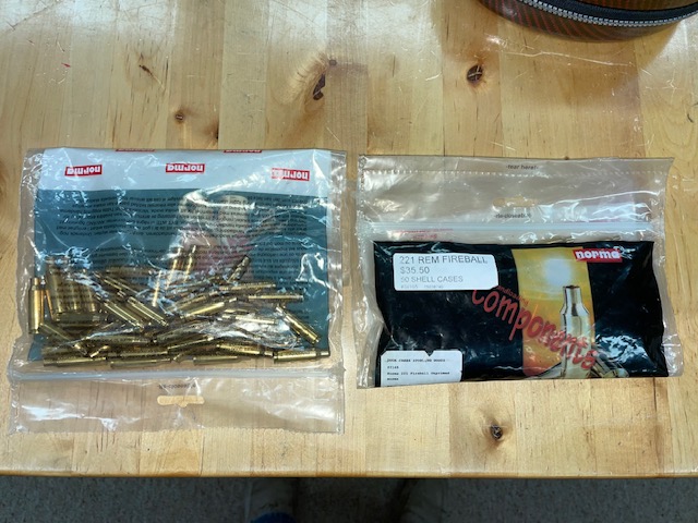 I have 2 New bags of Norma 221 Fireball brass that I will sell. These are new sealed 50 count bags. The price can be seen in the pic and I had shipping and sales tax cost on top of that. $45 per bag, total of $90 for both bags shipped. Let me know if you want them.