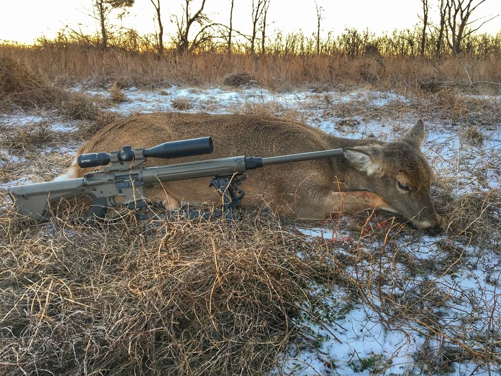 4 minutes later I spotted a group of 5 does and fawns making their way across the CRP. They were headed my way but were making their way down wind as well. I waited for a frontal shot because I wanted the opportunity to recover one of those cool 4 pedal bullets. I let it rip at 130 yards. Heard the WHOP and she ran 30 yards, stood there for 10 seconds and dropped. Impressed!
