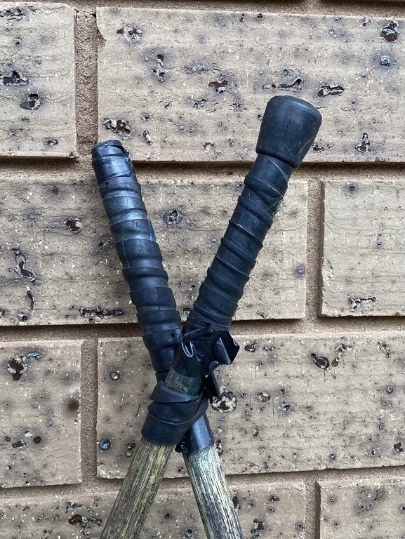 a taller person maybe would need a bit longer!? wound and banded together at the top by 1” cut strips from tyre tubes and knotted together. One at the top has a rubber knob, I rest my binos on that one for steady glassing. The bases have in each a glued in cement nail, and a rubber band to hold them together when transporting them. These work great, standing, kneeling or sitting on a log or even ground (I avoid that now because of my age!!!) one stick has about 5 self tap screws spaced along it, handy for lifting or separating fence wires when I need to get thru..