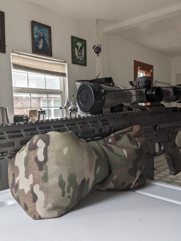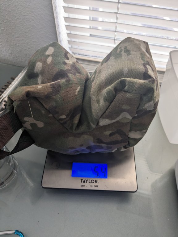 I recently took 1000D cordura and stitched together these shooting bags. For fill I am using an ultra light weight purlite. I attach this to my chest rig using a carbiner and don't even notice it is attached it is so light weight. I was originally concerned with stability with the squishy fill but it has performed extremely well.