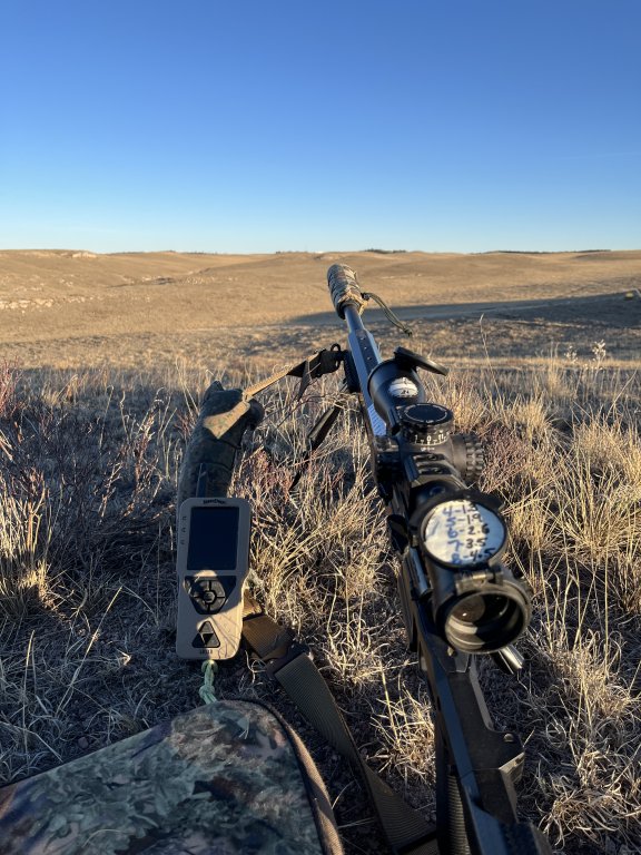 4th stand- I spotted a bright white chest looking at me from the East, Sun was getting low. I switched over to sage rat and it crept in another 30 yards and stopped at 294yards. Christensen MPR 6mm Creedmoor made quick work of it.