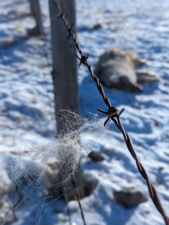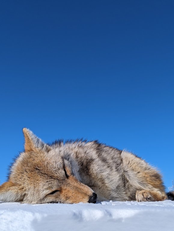 Another bait coyote at the ranch. She was sunning herself on a snowdrift and refused to believe the rumbling tractor was a threat... Her mistake.