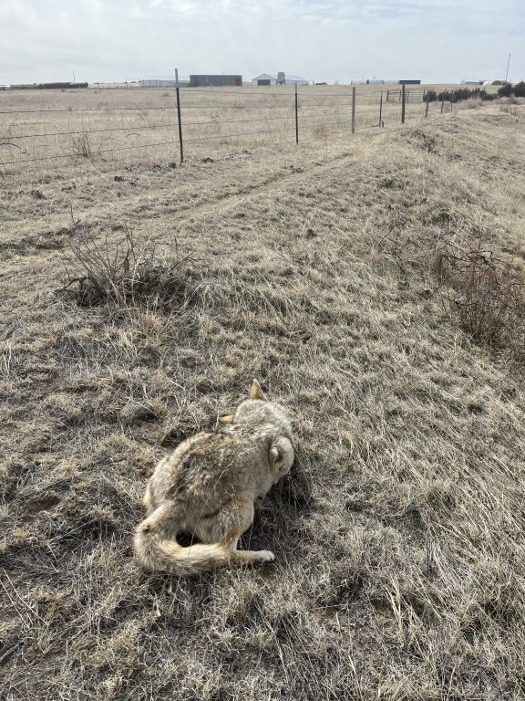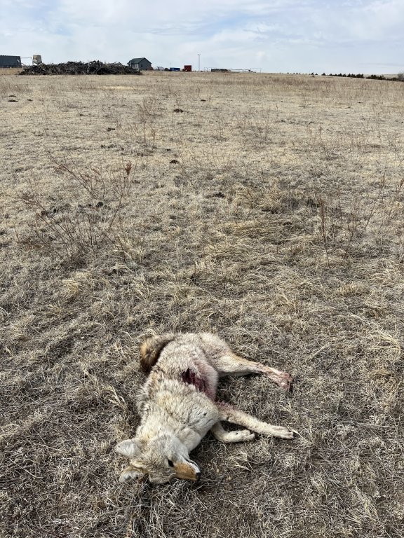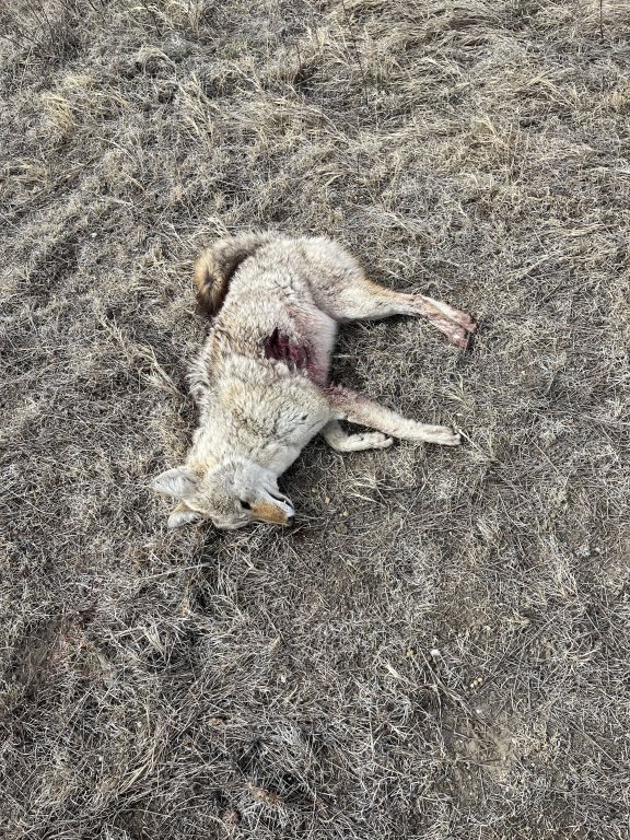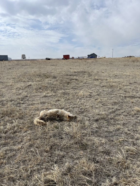 Another bait coyote at the ranch. She was sunning herself on a snowdrift and refused to believe the rumbling tractor was a threat... Her mistake.