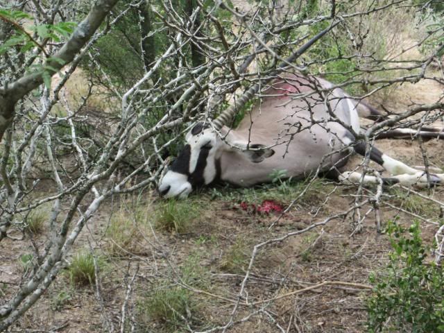 It was not until 2:00pm that we saw the first oryx which was a broken horn that Cody did not want to pursue. Then at about 4:45 we found a group of 18 oryx that we had spotted on our scouting trip. After stalking the herd for about 20mins Cody was within a 100 yards of the herd. After deciding which one he wanted and a well placed shot from the 270 Weatherby magnum and 150 grain Barnes bullet a nice bull went down. It measured 31 3/8 inches on the left and 31 1/2 inches on the right. Nice way to end the day of hunting with only about 20 minutes of hunting time left.