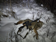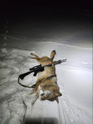 Wind up here in Western NY has been brutal. Been over 15mph almost the last two weeks, some nights dropping to low single digits. But, Saturday night, weather was perfect. Under 10 degrees, 0-5mph winds, so a buddy and I headed out. First three sets in his spots, blanks. 4th set, walk in corn field, see about 10 deer, scan right and there was a bedded 'yote. He dropped the sticks and popped a shot at about 200yds. Hit it, tracked him for about15 min and lost him in the thick shit, so called it. Struck out next set. Headed to a new area for me, owner says dogs have been around. Set up the call, hit it and 30 seconds later we whack a 38# guy when he was 10yds from the call. Went and grabbed him and noticed a second set of tracks....guess we didn't see the second one, oops. My buddy went home, and I wanted one last set. Hit the call, 15 minutes later two show up, popped the bigger one at about 50 yds (vid) weighing in at 42#. One of out better days, 2/3 on 6 sets.