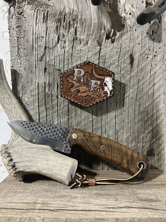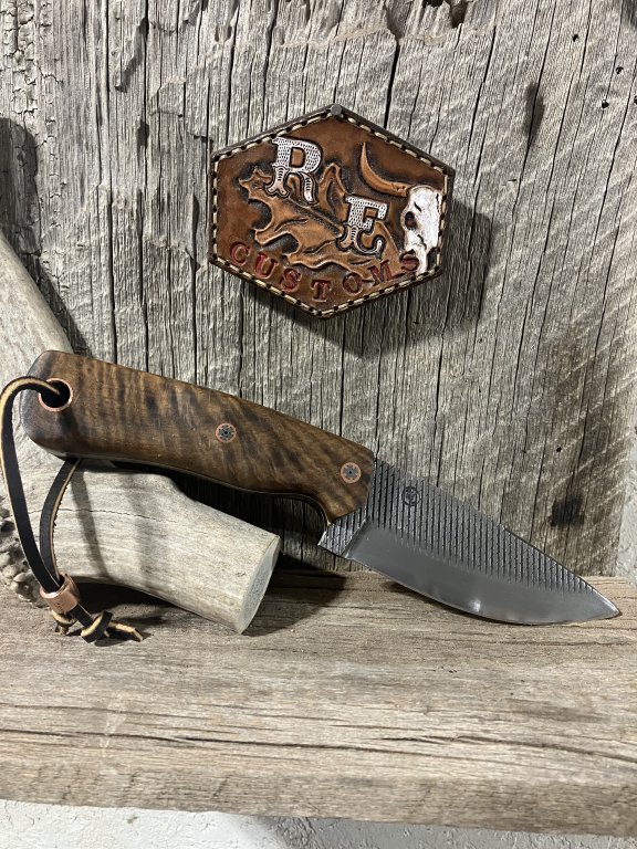 R Rellis Custom Accessory Maker Nov 12, 2025 #1 What we have here is is a hoarse rasp Hunter measuring, 8 1/2” long with a 4” blade. It has a white oak Burl handle with mosaic pins and maple liner. Comes with custom knife sheath also made by me. $ 145 to your door, thanks for looking. Attachments IMG_3553.jpeg 152 KB · Views: 38 IMG_3555.jpeg 160.9 KB · Views: 32 IMG_3554.jpeg 164 KB · Views: 35
