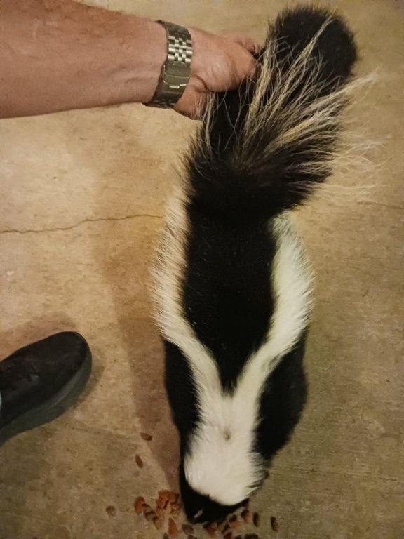 Ya it Alive, that particular skunk is on it 3rd summer old. Him and his brother from a Litter hang pretty tight. I walked out back door tonight, and whistled, he was around and he ran up to my feet. He was soaked wet when I was rubbing him, it pouring down rain here off-on tonight . That Litter 3 yeas back, he and his brother come from 'genetically' all had a Black Spot on the back of their heads behind the top of their white haired crown on top their heads. you can see it in the Pic. in above post.