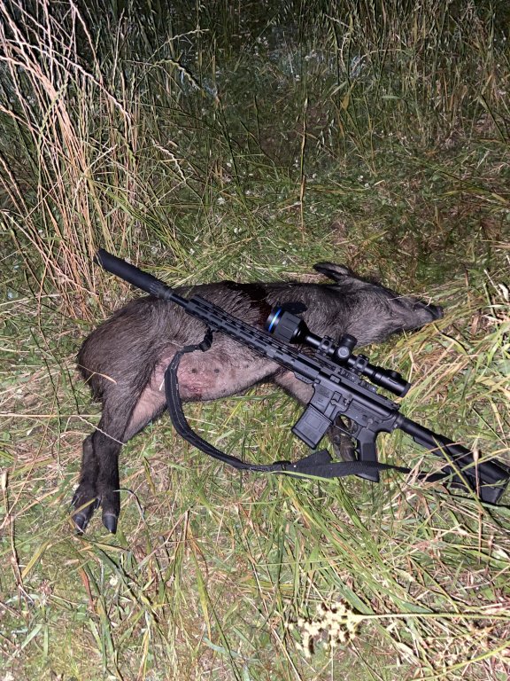 Saturday night I walked to the 5 acre plot that it about 400 yards from the house and as soon as I got there I could hear some grunting. I got the gun on the sticks and turned in the scope, there was a single boar 30 yards away and shot him quick without hitting record.