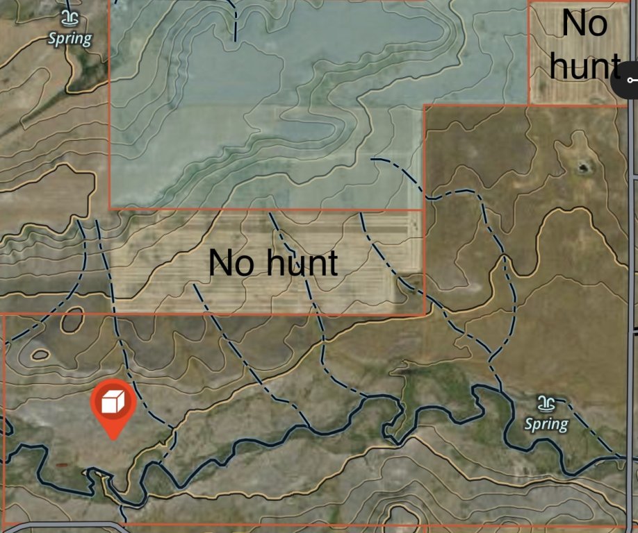 It’s hard to say for sure without seeing it in daylight from ground level, but I’d start by walking in low along the blue line. Set up somewhere in the purple area, with the call placed near the white “C.”, targeting that creek. I’d avoid going too far west on that hill so you can still see the downwind side back toward the spring.