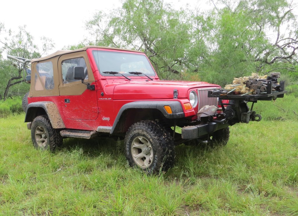 The much smaller interior of the little TJ was quite a challenge, but a little S. TX engineering provided a shelf over the sun visors for calls, gloves, etc, a saddle scabbard over driver's left shoulder carried the Stevens 20 ga youth snake gun and an improvised rifle rack held two rifles safe and secure, yet readily available. A couple of canvas cargo bags held the rest of our paraphernalia on the back of the seats.